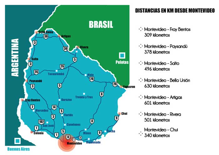 | Siempre pensando en facilitar la comunicación con nuestros clientes aquí dejamos a su disposición las fronteras de todo el uruguay, con sus correspondientes distancias siempre partiendo desde Montevideo. |